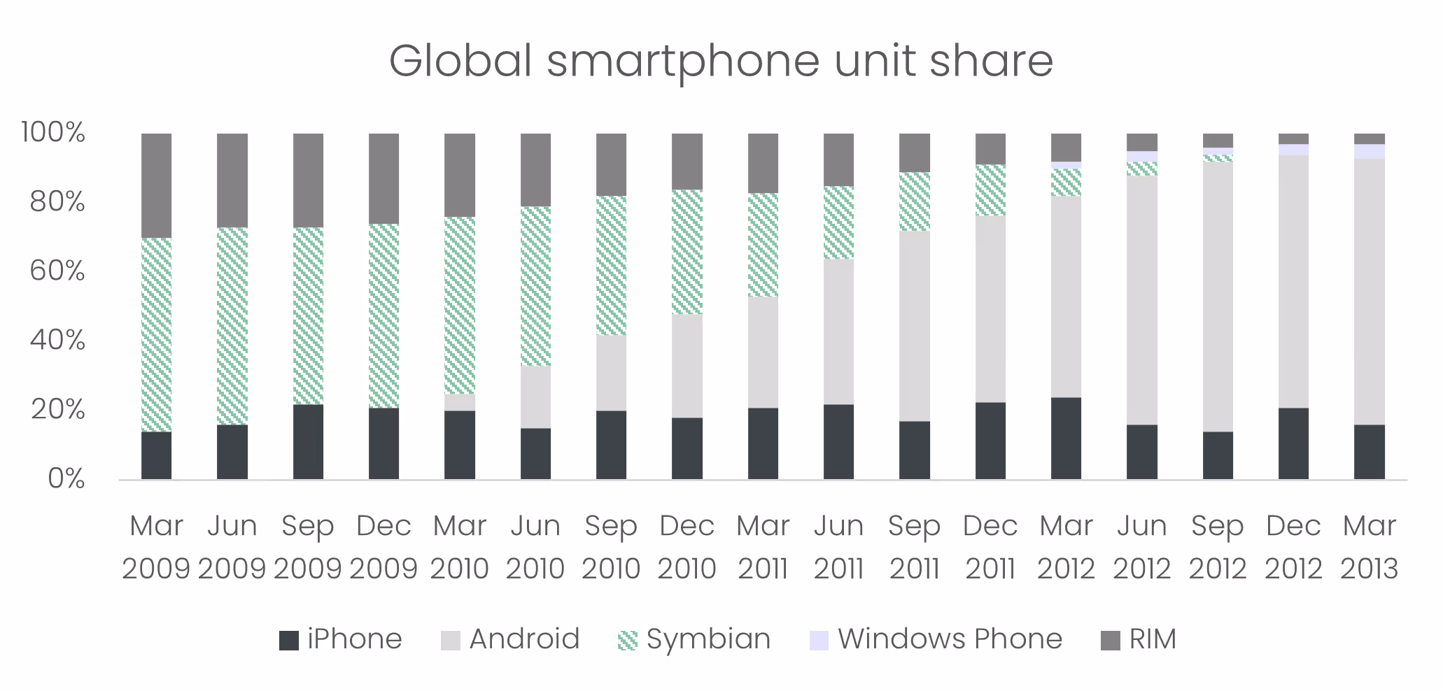 Zooming into the framed green we find that Europe has not invented nor provided the critical infrastructure of personal computers, and its mobile phones have been wiped out by smartphones. The following graphic depicts the market share of smartphone operating systems. Nokia’s Symbian – the only European contender in the pack – was dominant in the late 2000s. But then Android ate its lunch.