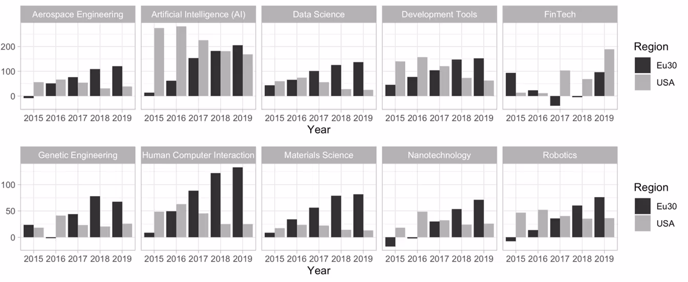 6 Net Change in Talent Migration is defined as “The net gain or loss of members from another country with a given skill divided by the number of LinkedIn members with that skill in the target (or selected) country, multiplied by 10,000” (World Bank and Linkedin August 2020B). We calculated the Eu30 number as a simple average of the group’s countries. Net Change in Talent Migration normalizes for different sizes in skill populations. As these populations are similar in the Eu30 and USA we can also infer absolute, non-normalized changes with strong confidence.