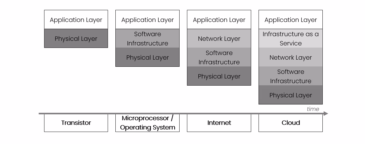 The following graphic applies the tilted croissant to the evolution of the software stack. In the beginning, there was the transistor, and the transistor was with the physical layer, and the physical layer was good. Writing a new application required rewiring transistors – until the first programmable microprocessor spawned the first software infrastructure – and operating systems expanded upon it. The internet then established the network layer. Most recently, Cloud found a further abstraction to build upon in Infrastructure as a Service.
