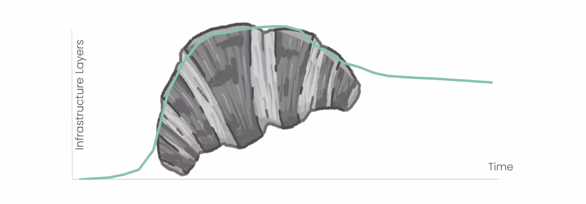 Establishing the first GPT-specific infrastructure layers takes time, as it is initially expensive to ready the market. Yet, as soon as their foundation is laid, the number of GPT-specific infrastructure layers quickly proliferates. That is, until the point at which individual layers have become commoditized and become bundled again to achieve synergies in integration. Graphed, then, the number of GPT-specific infrastructure layers follows a tilted-croissant trajectory: