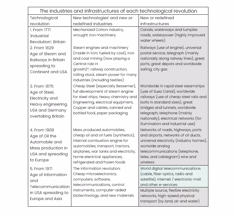 1 Perez’s technological revolutions differ from General Purpose Technologies (GPTs, see definition in footnotes below). They are GPTs, but most GPTs are smaller in scope.