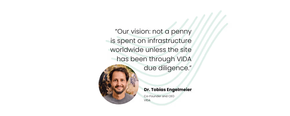 Right now, we’re focused on collaborating with key infrastructure investors. In terms of scale, these funds control the future of infrastructure investment globally, a trillion dollar industry. Our vision is that not a penny is spent on infrastructure worldwide unless the proposed investment site has been through the VIDA due diligence process.